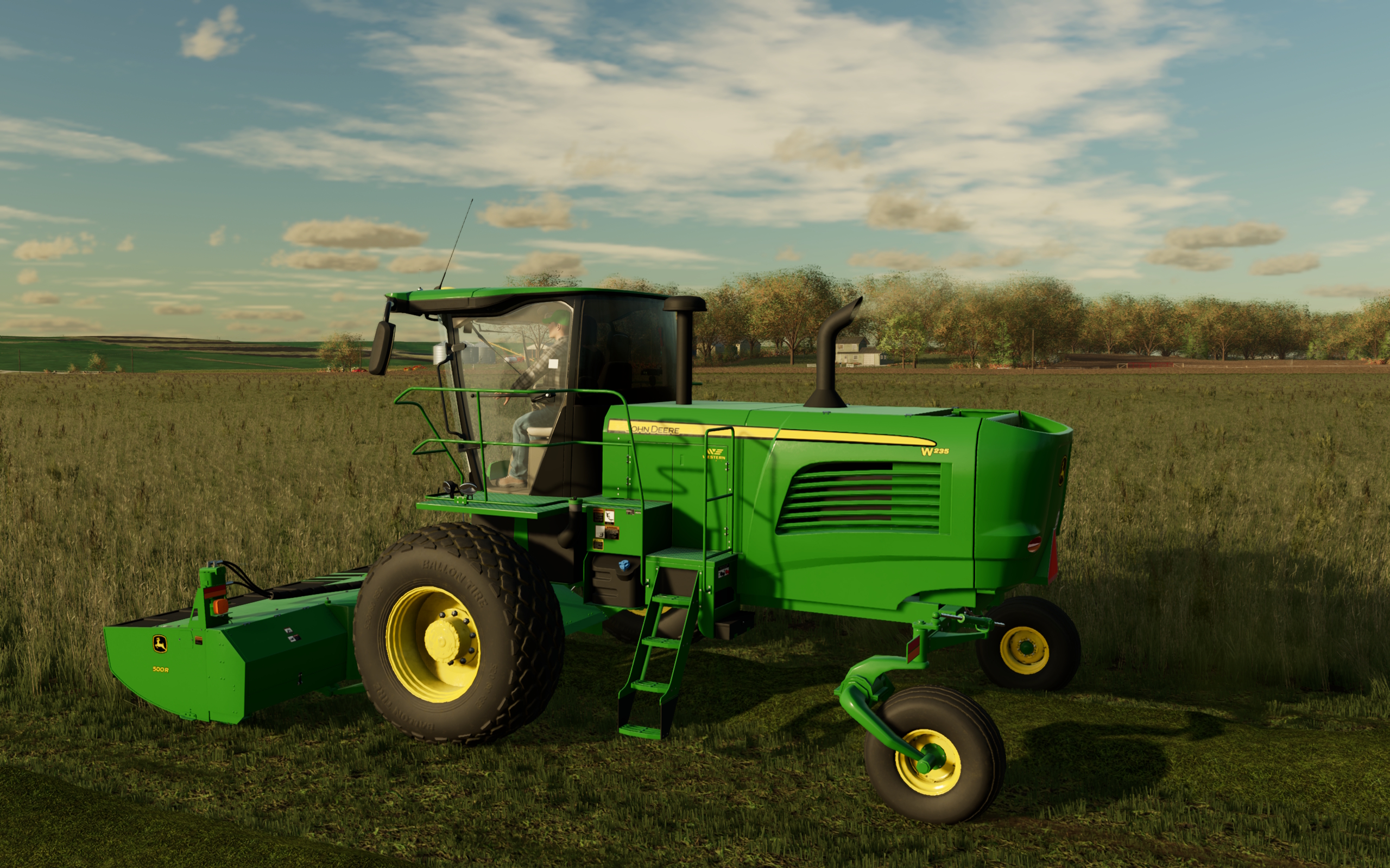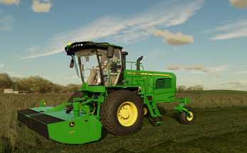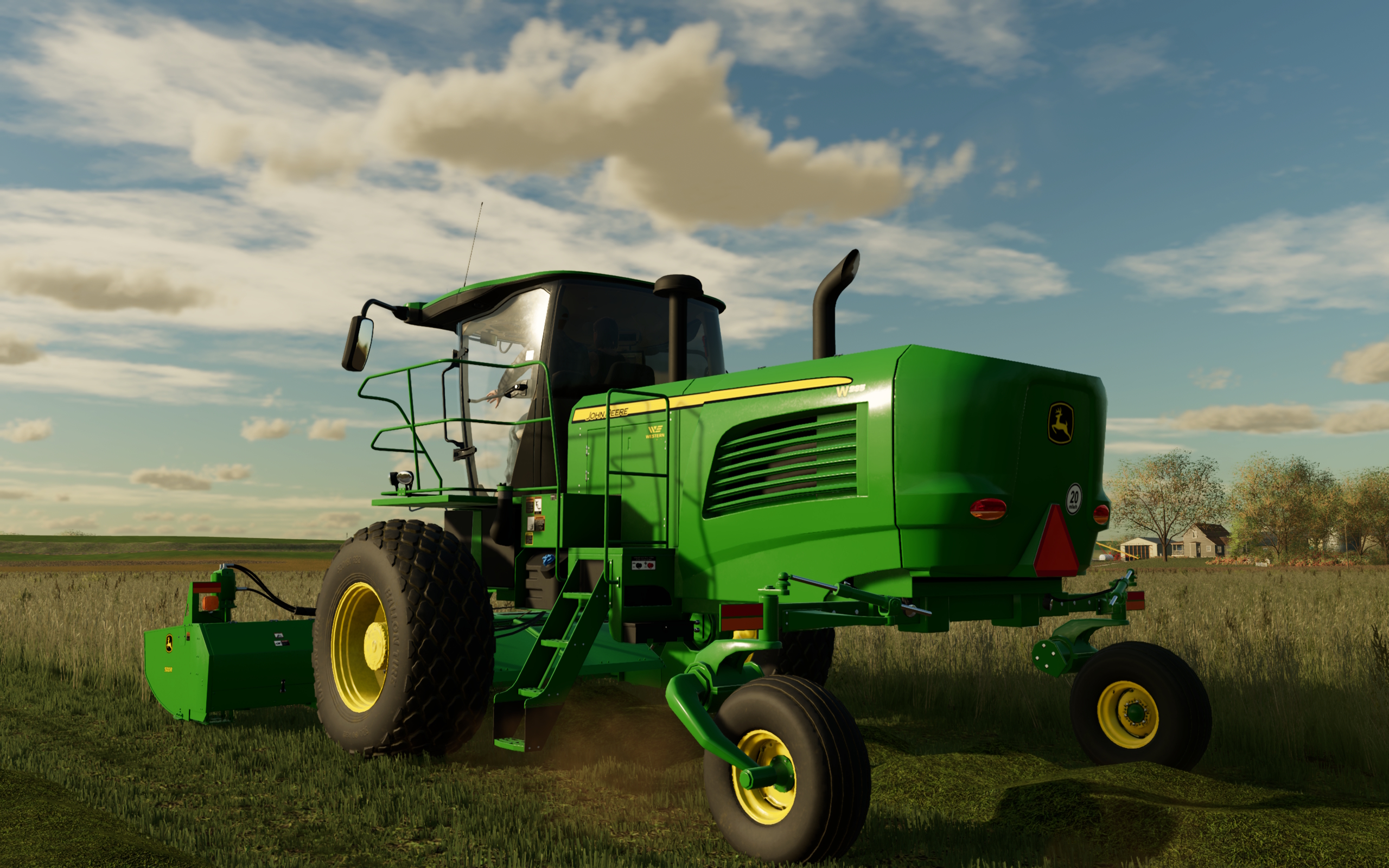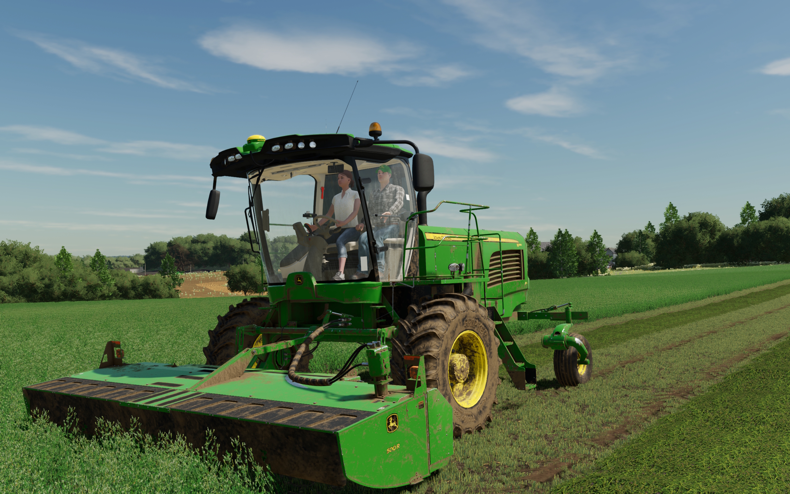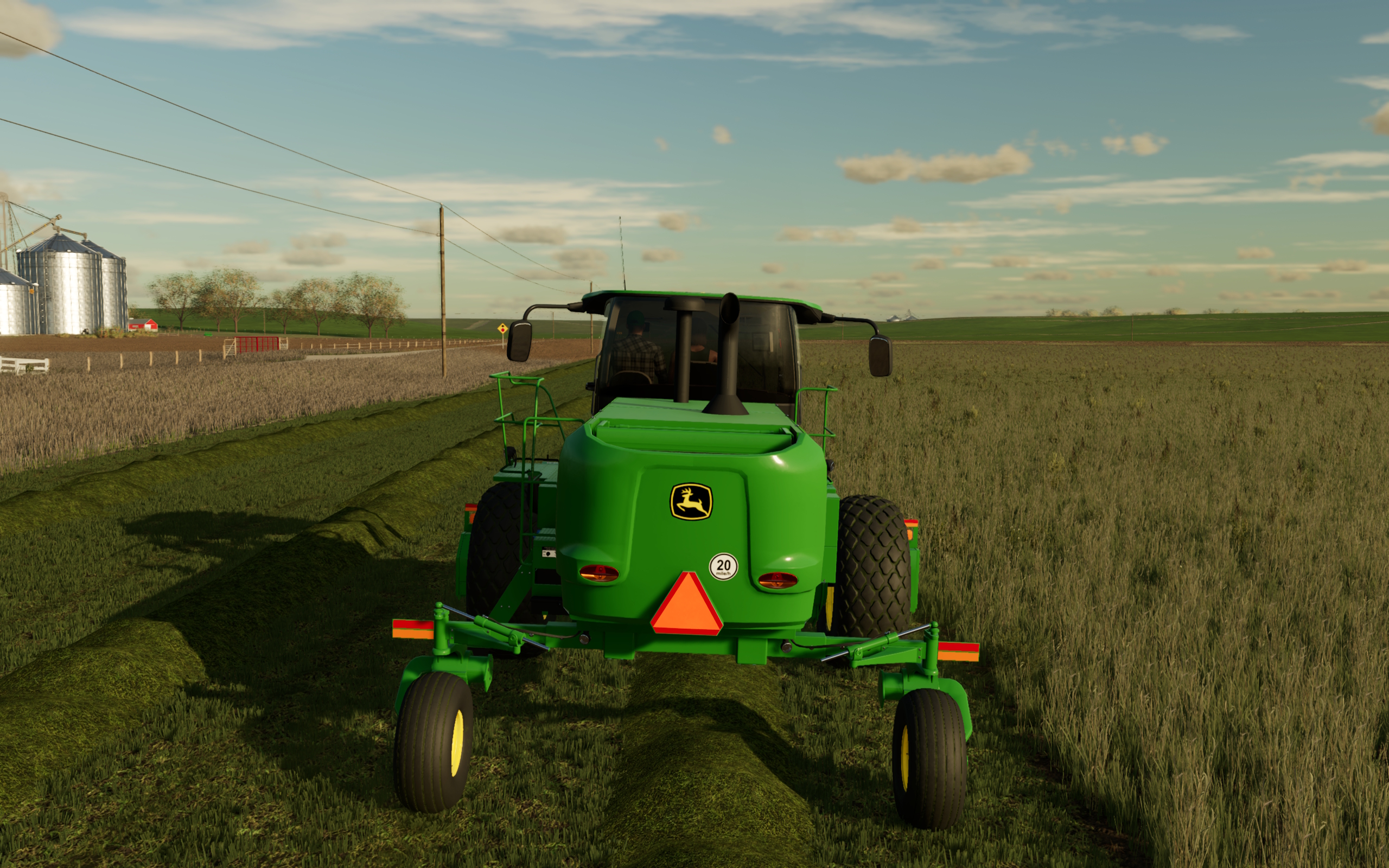Accurate lighting internal and external with animated knob and LED indicators on CommandArm. 16 foot 500R rotary cutter bar with "windbent" custom tarp, updated hazard lighting, V-10 steel conditioning rollers with respective bearings and tensioner spring, anti-slip strips, inspection and maintenance panels, swath flap positioner, gauge shoes, realistic upper attach bracket, re-worked flexible hydraulic hoses, realistic decals, tons of hardware, and an accurate drive motor. Accurate work lights forward and rear. Accurate cab details such as mirrors, cowls, rear tinted window, new diesel and DEF caps, new exhaust pipe, work platform, and steps. Inside the cab you'll find displays that indicate float pressure, rotary speed, changing gear indications (1 and 2), working engine speed buttons, engine hours, gal/hr, and power consumption. You'll find an animated header engage switch as well as an animated turn signal/high beam knob. With the fold down GreenStar 3 2630 and the help of GuidanceSteering with Dashboard Live you can enjoy accurate guidance OFF, ON, and ENGAGED indications, deviation from current GPS track both in feet and visually as a slider bar all on custom screens pulled directly from John Deere's GreenStar 3 simulator.